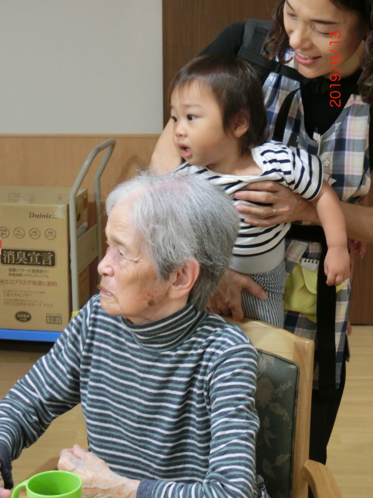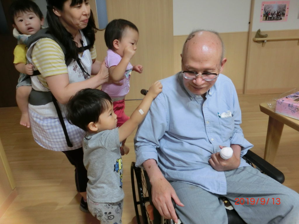 それから、「肩たたきの歌」をみんなで歌いながら、入居者様の肩を優しくたたいてくれたり、握手をしたりして触れ合いました。