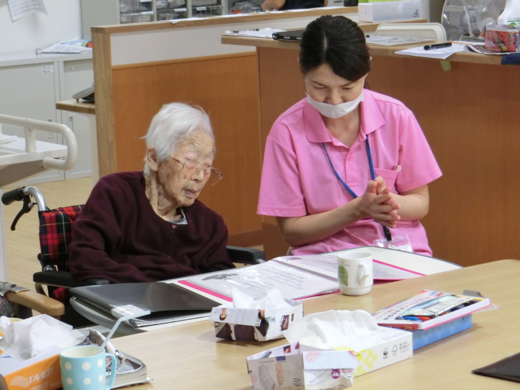 こちらのユニットでは、リビングで職員とコミュニケーションを楽しんでいます。こちらの方はご主人の事や若いころの話をよくしてくださいます。