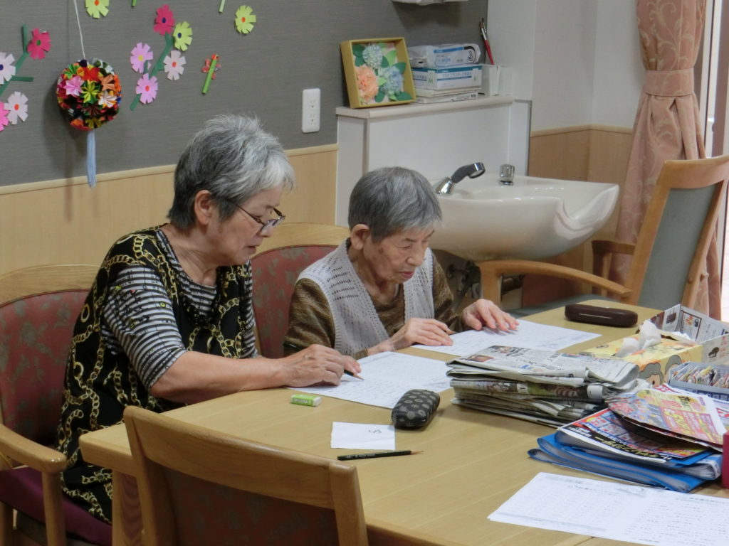 次にこちらのユニットでは、ご一緒に脳トレをされています。これが結構難しいんです。