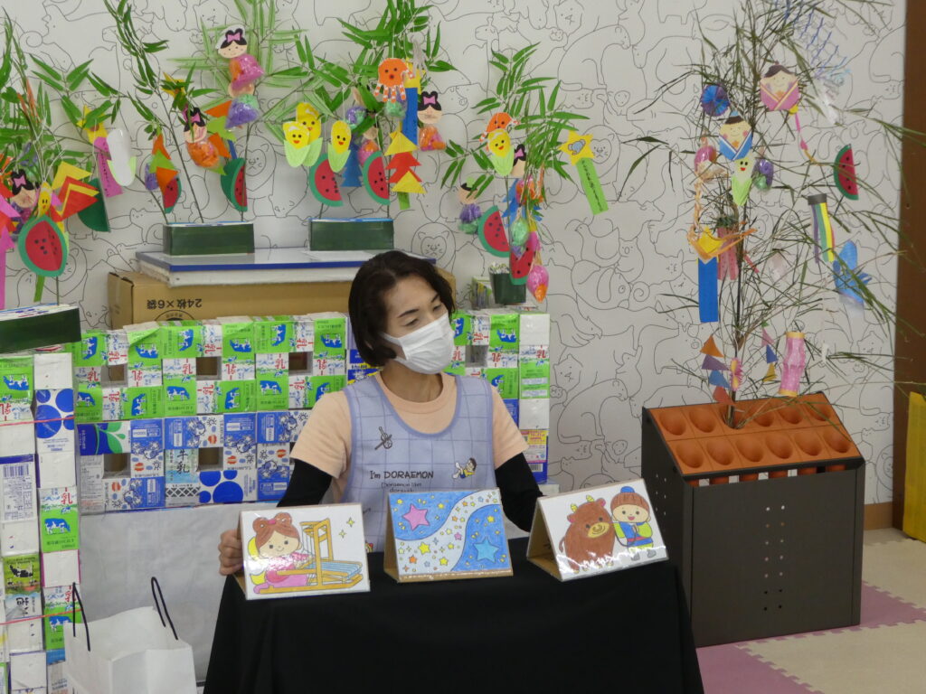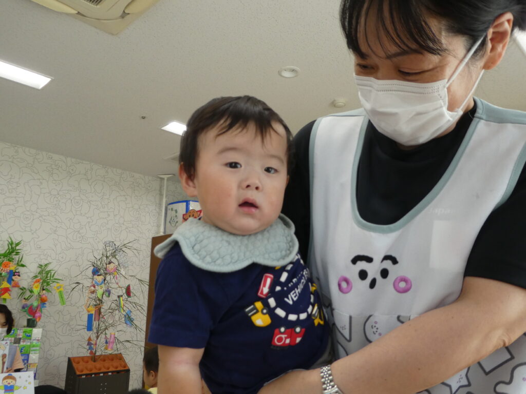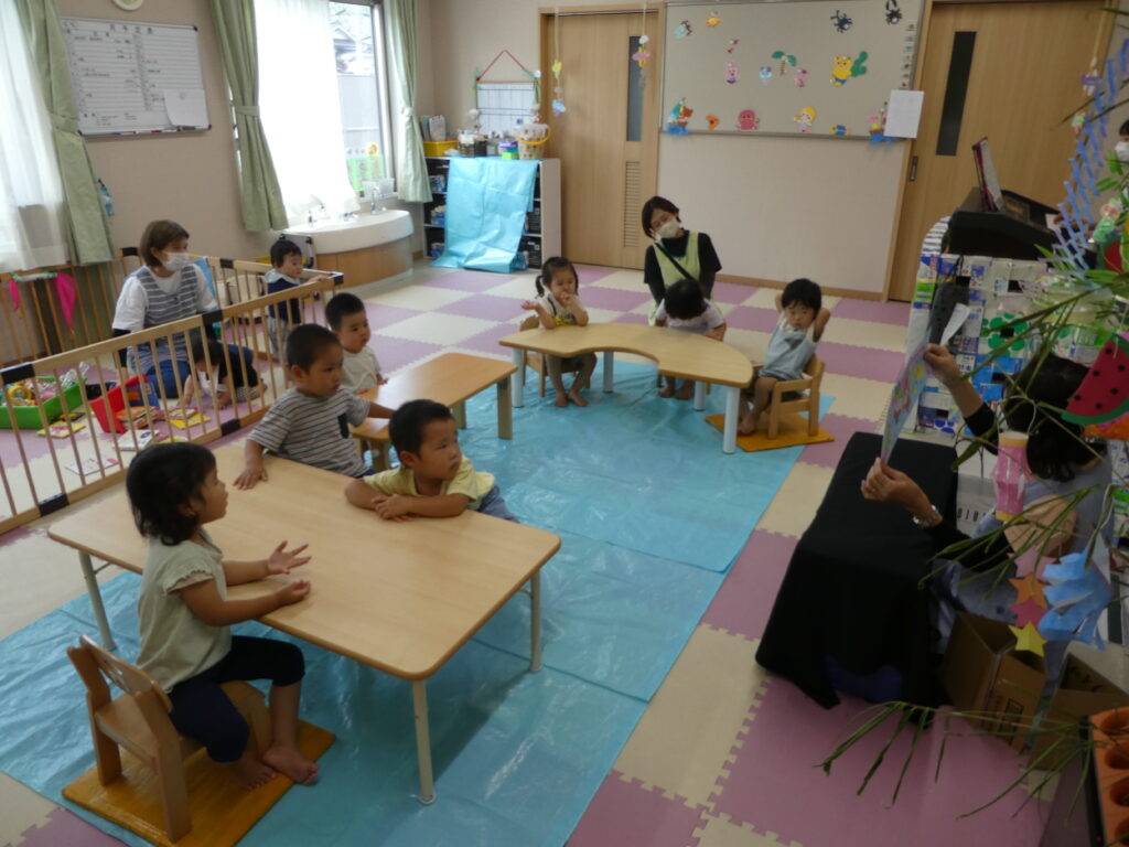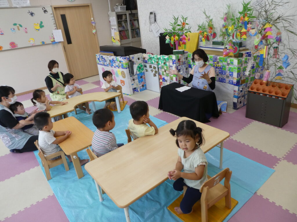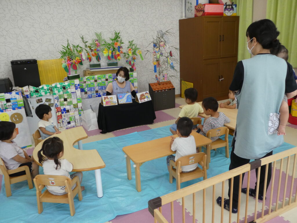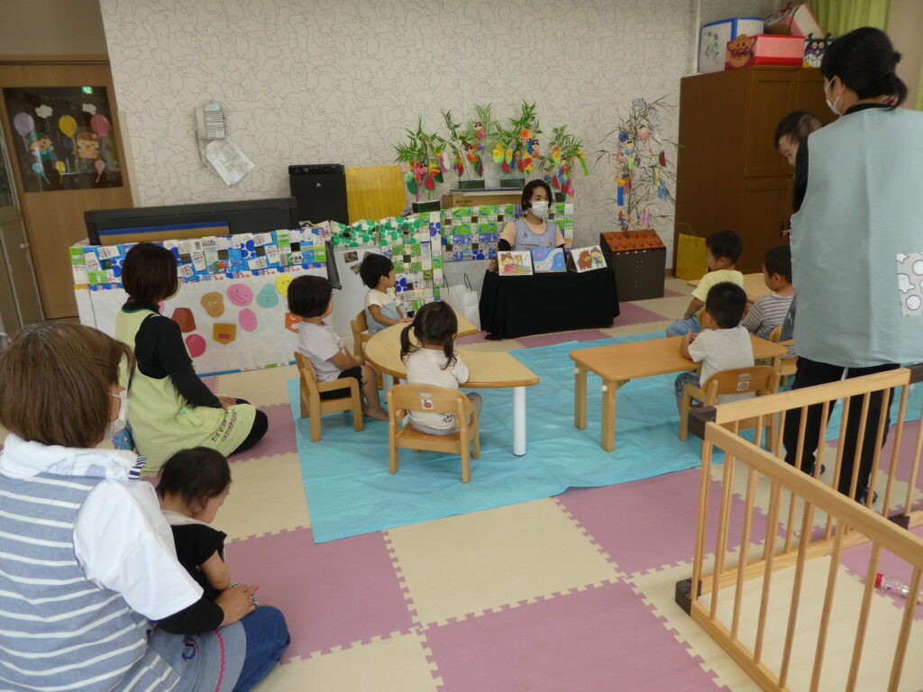 会では七夕の由来を聞いたり、笹飾りの意味を聞いたりしました。