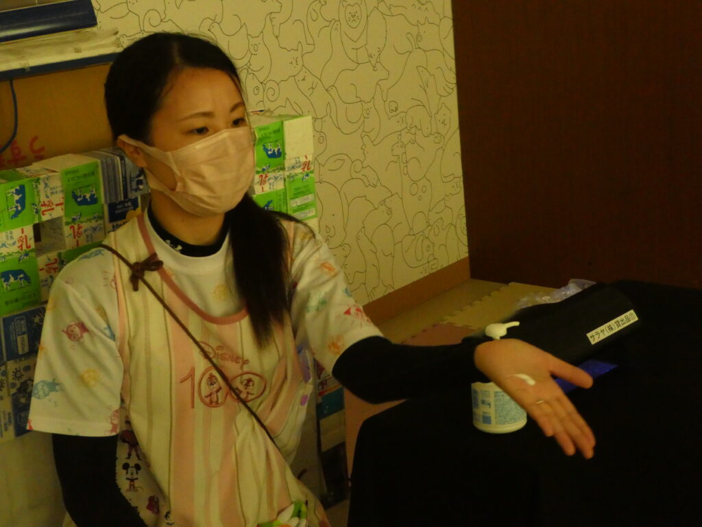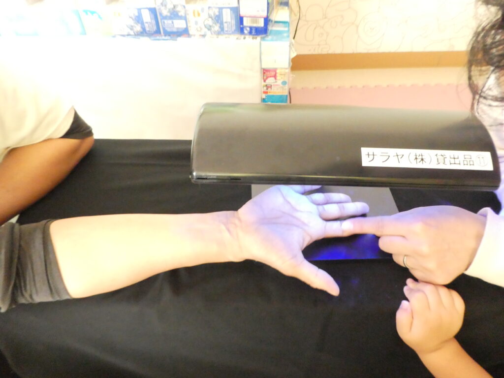 手洗い後、再度ブラックライトに手を当てチェックしました🫧