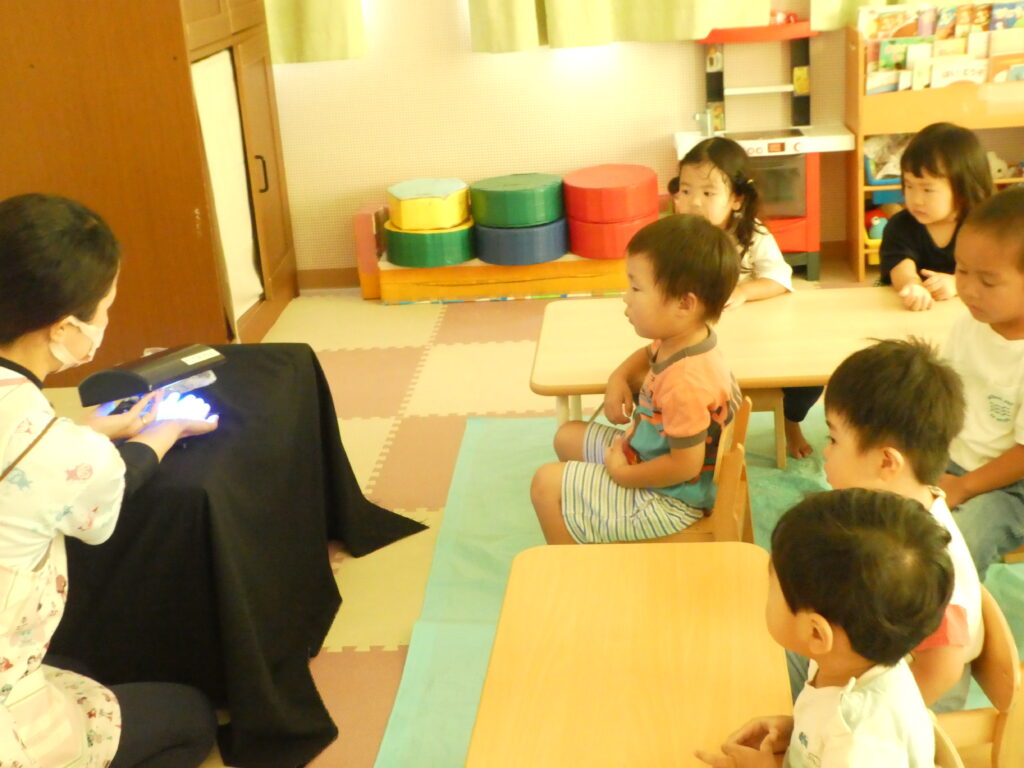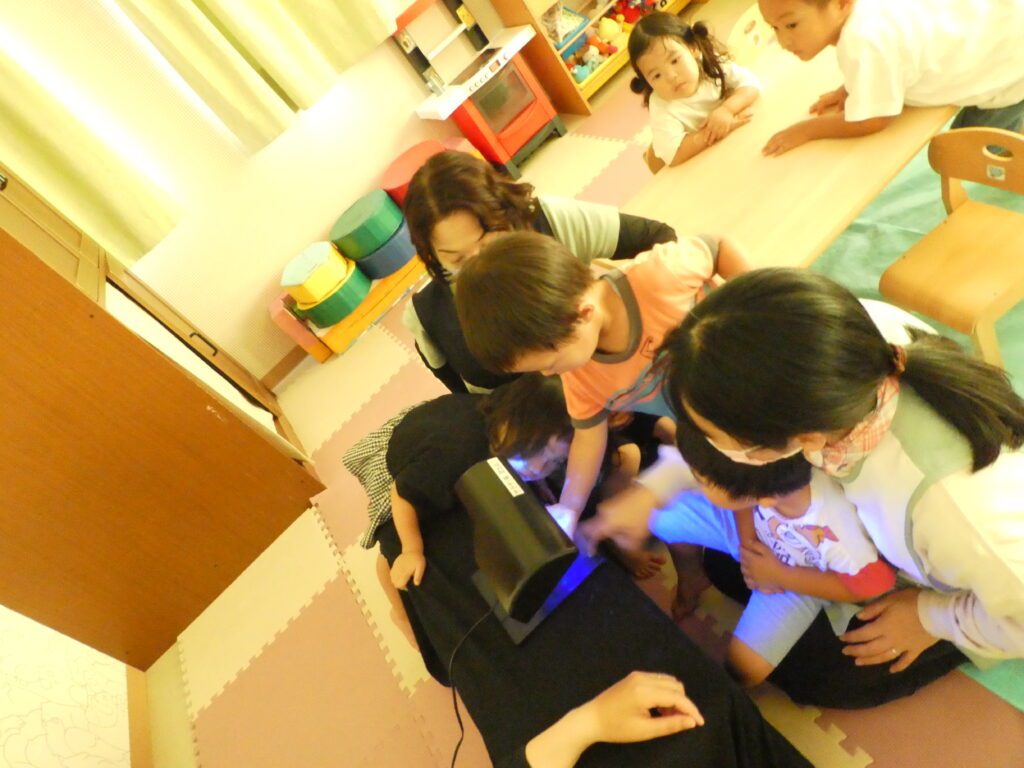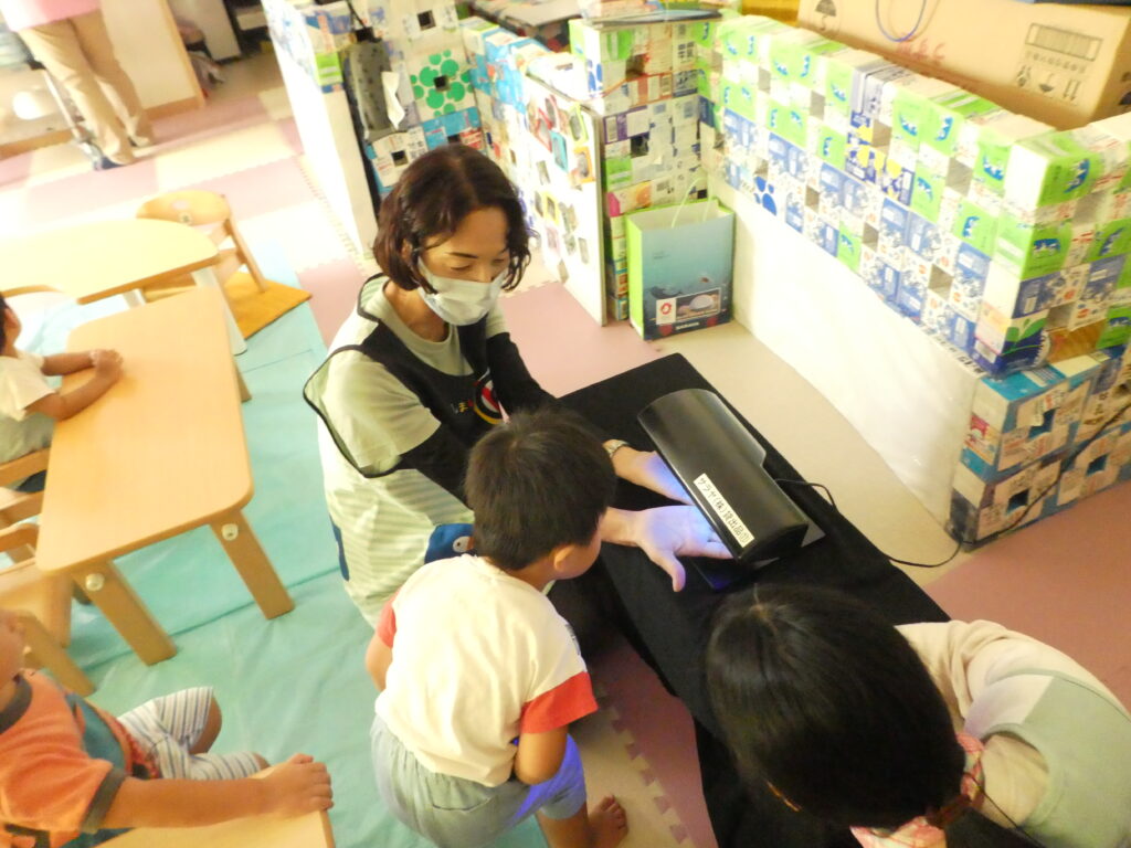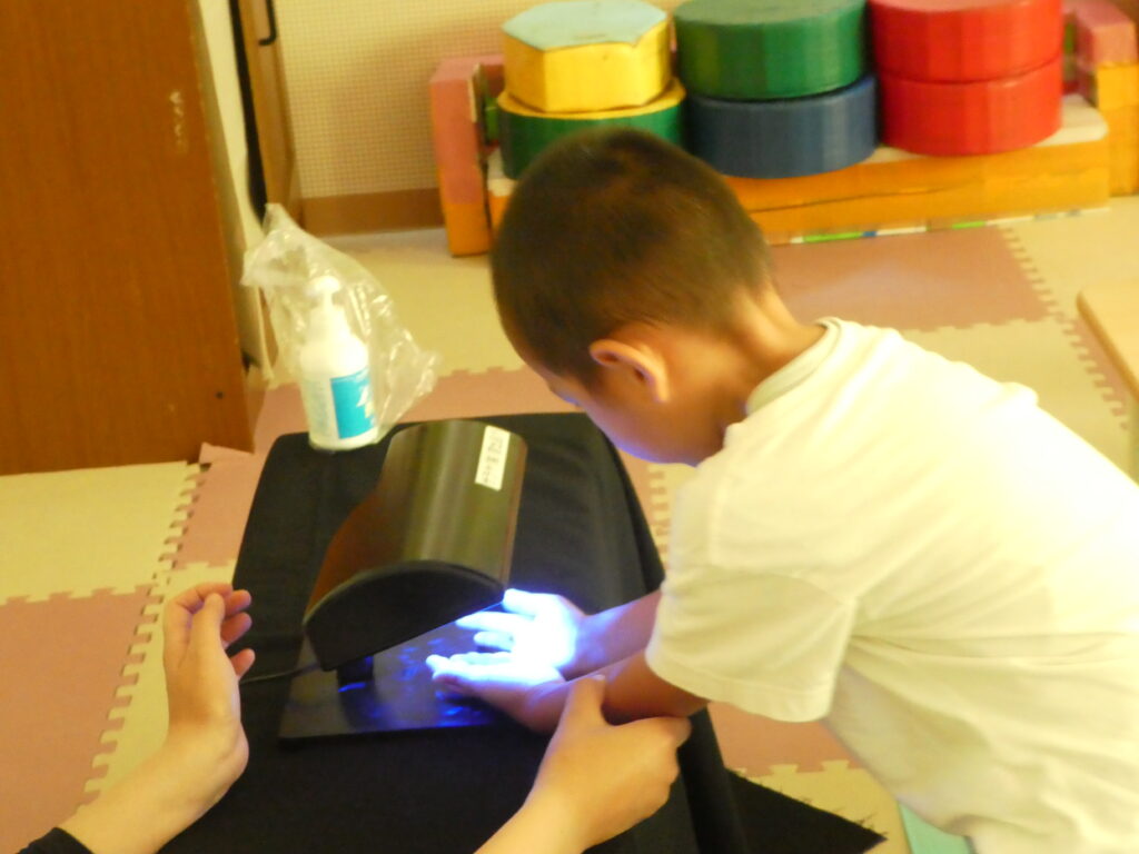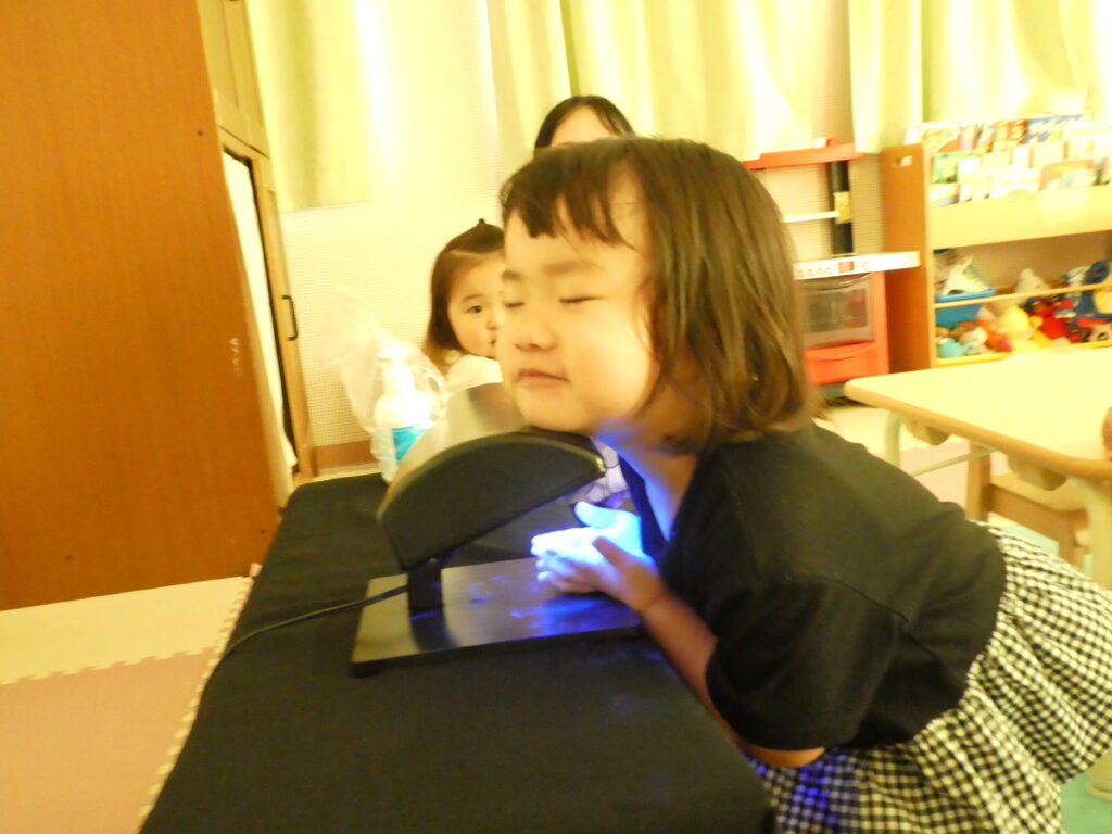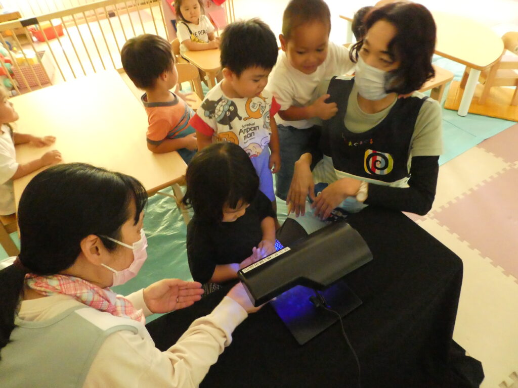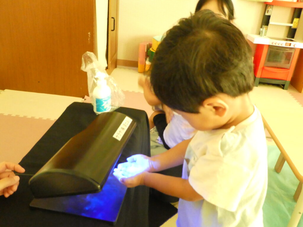 今日は戸外遊び後、『手洗い チェッカー』と言う物を利用して、日頃のみんなの手洗いのやり方を、見直しました。