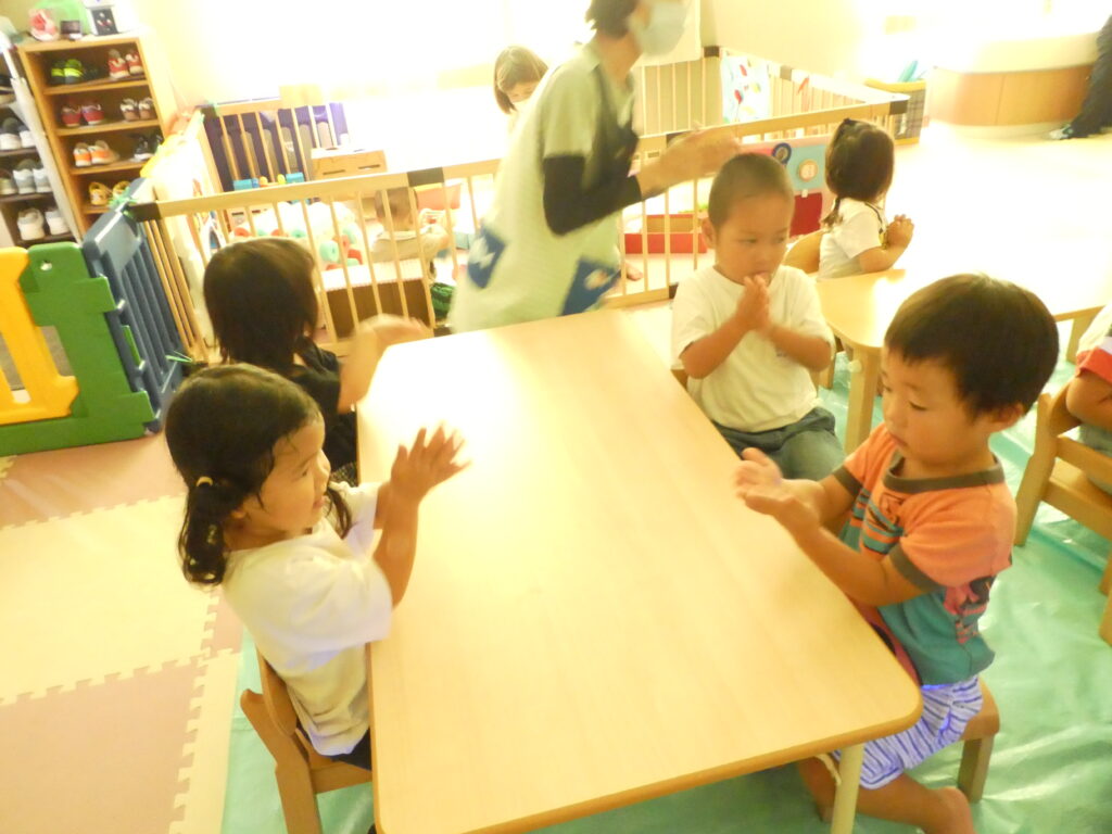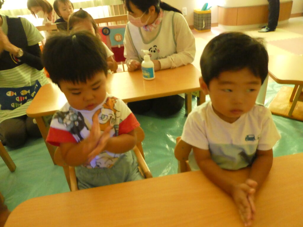 子ども達は、自分の手を見てびっくり!!😮白くなっていたので、もう一度丁寧に手洗いをしました。