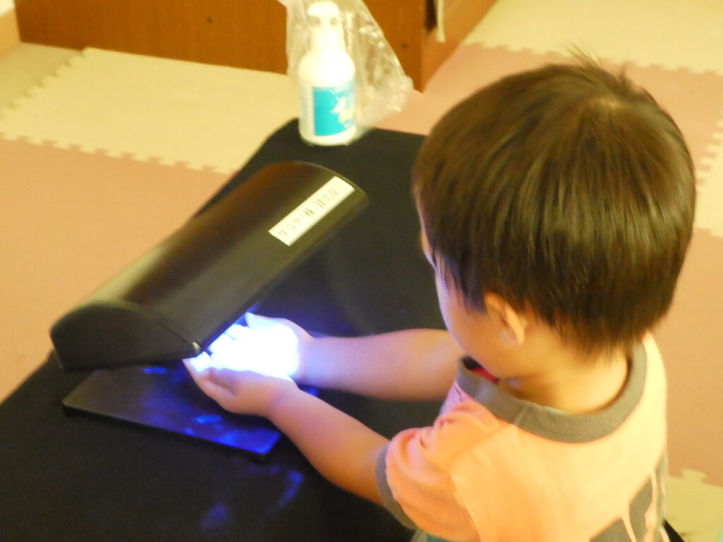 いつもの手洗い後、ばい菌が見えるジェルを付け、ブラックライトに手を当ててみました。