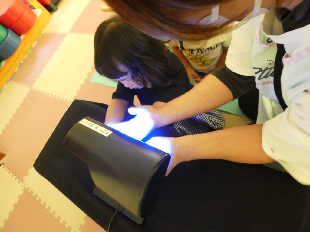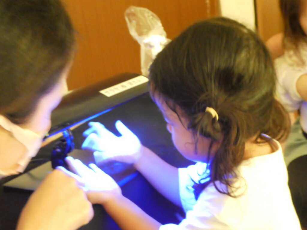 クリームを付けて、ブラックライトに当てるよ!
