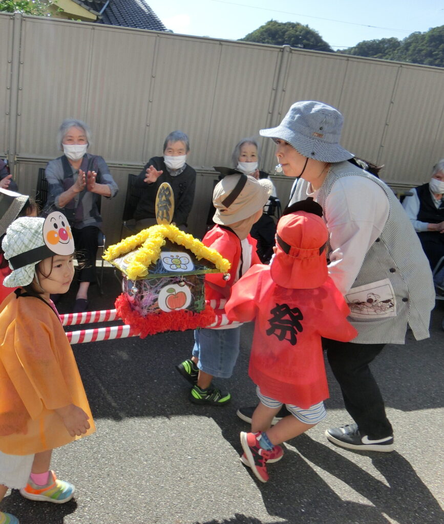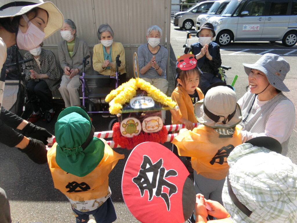 秋晴れの今日、今年もキッズの子ども達がお祭りごっこでお神輿を担いでケアハウスの前を練り歩きました!