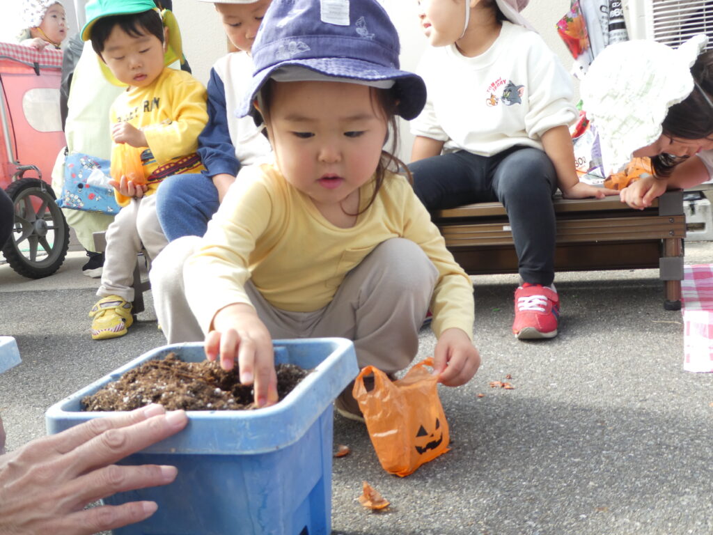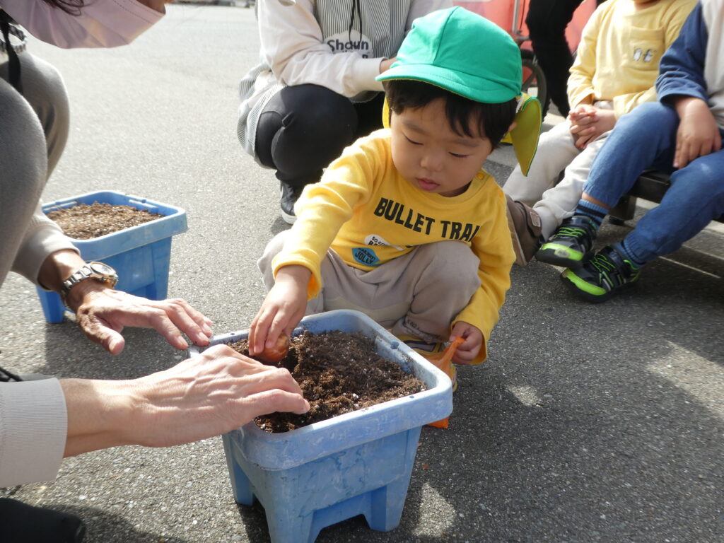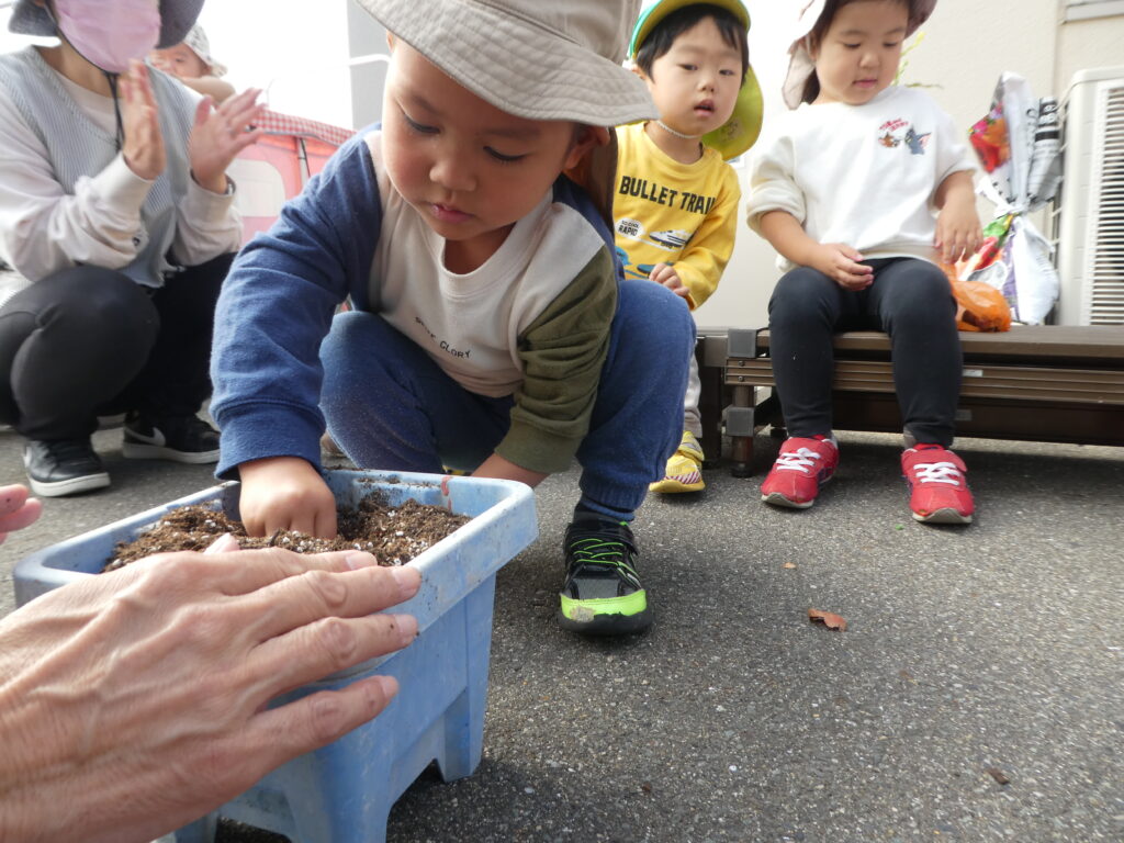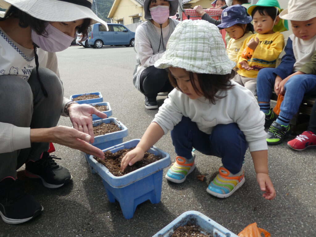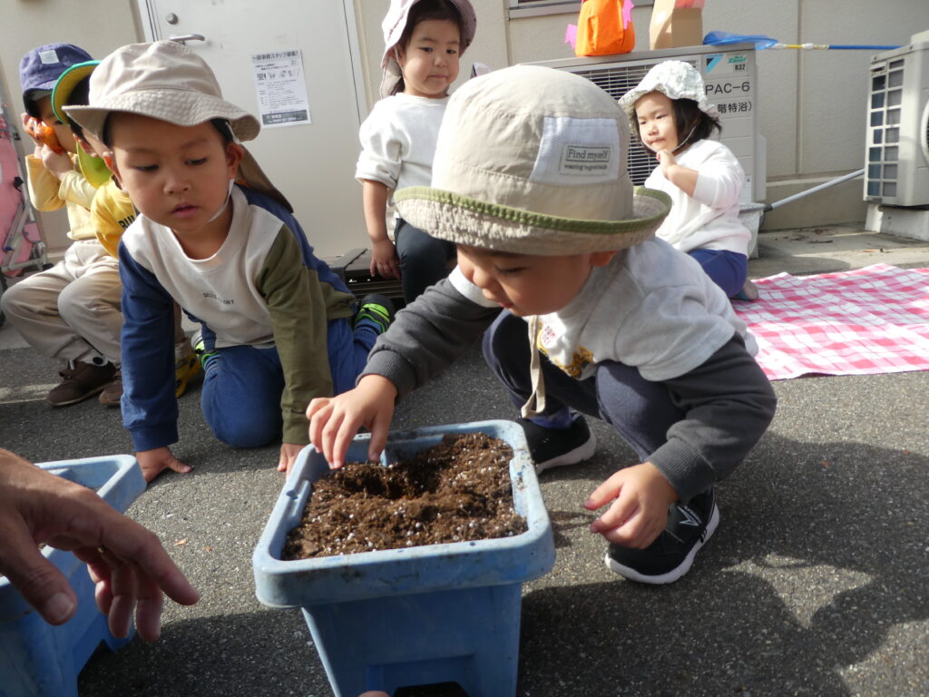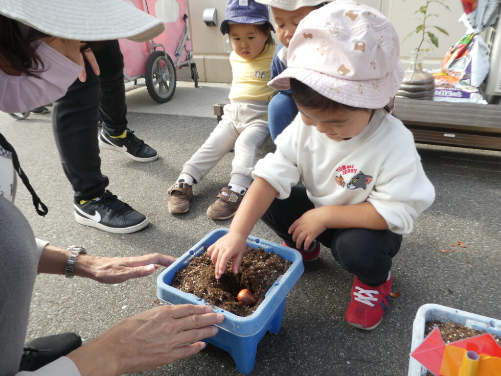 クッキングの後は、先日のHalloweenで園長先生からもらった、チューリップの球根を植えました。