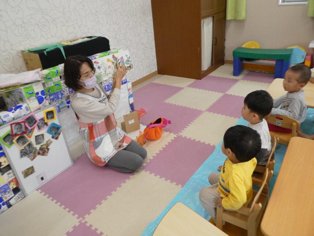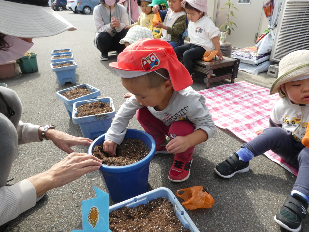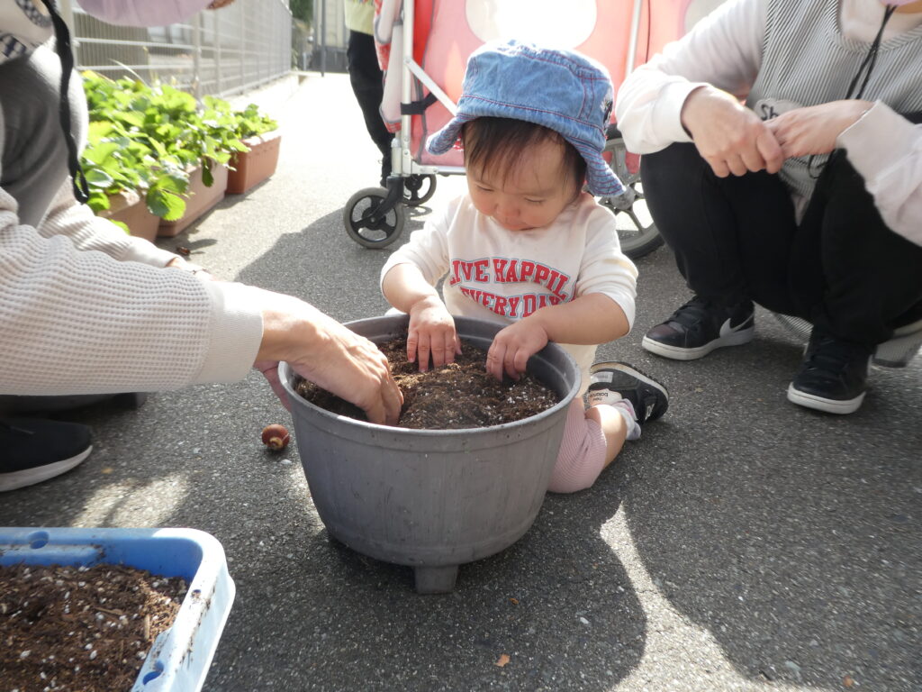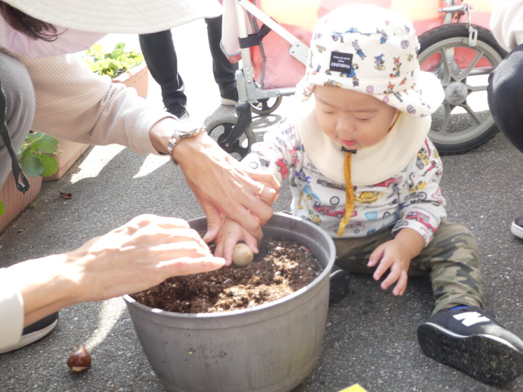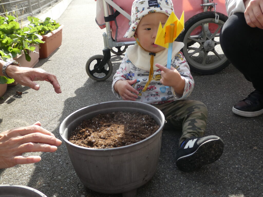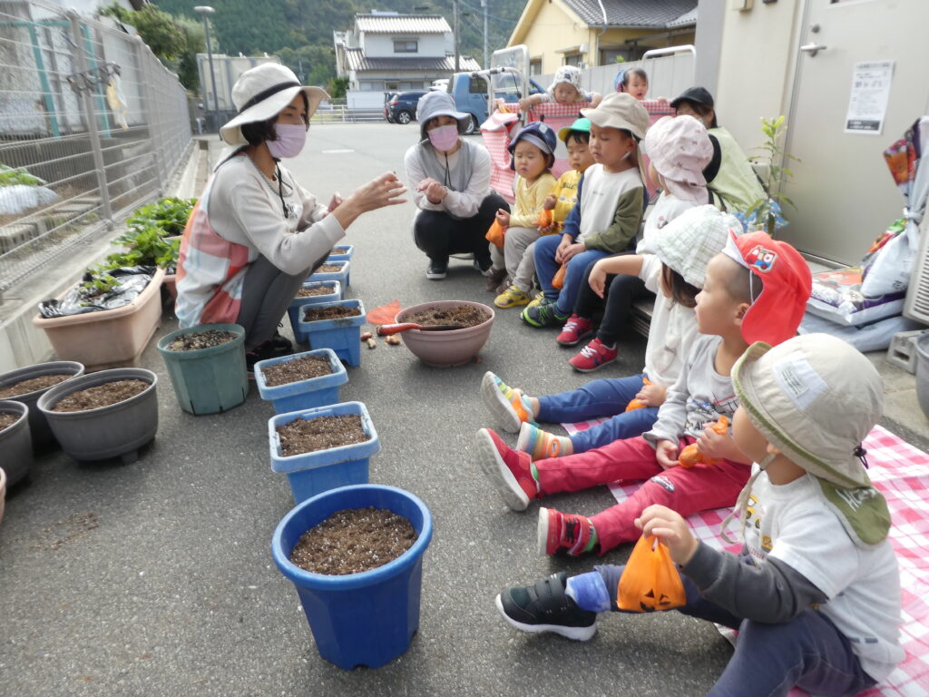 クッキングの後は、先日のHalloweenで園長先生からもらった、チューリップの球根を植えました。