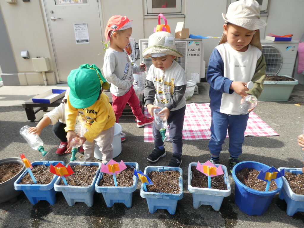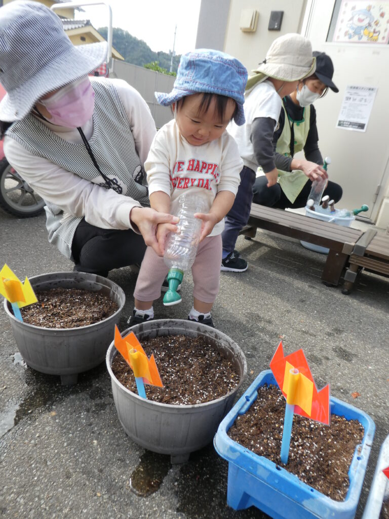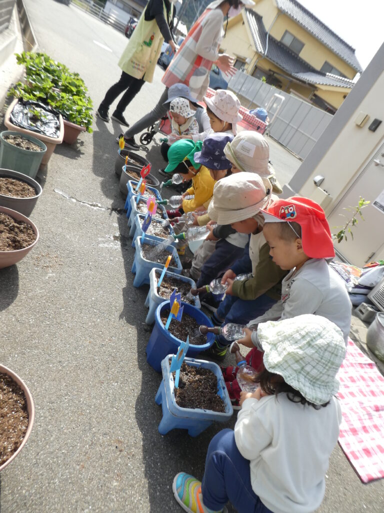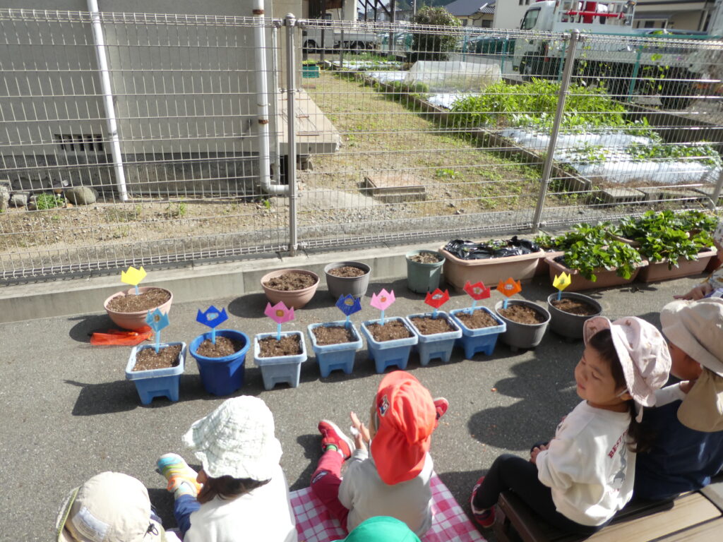 「何色が咲くかなぁ???」「おおきくなぁれ」と楽しみにしながら、植えました😊🌷