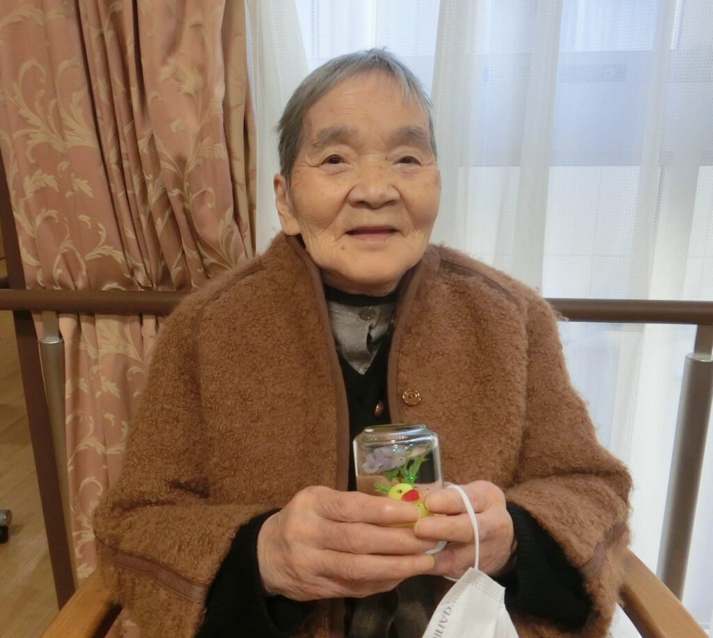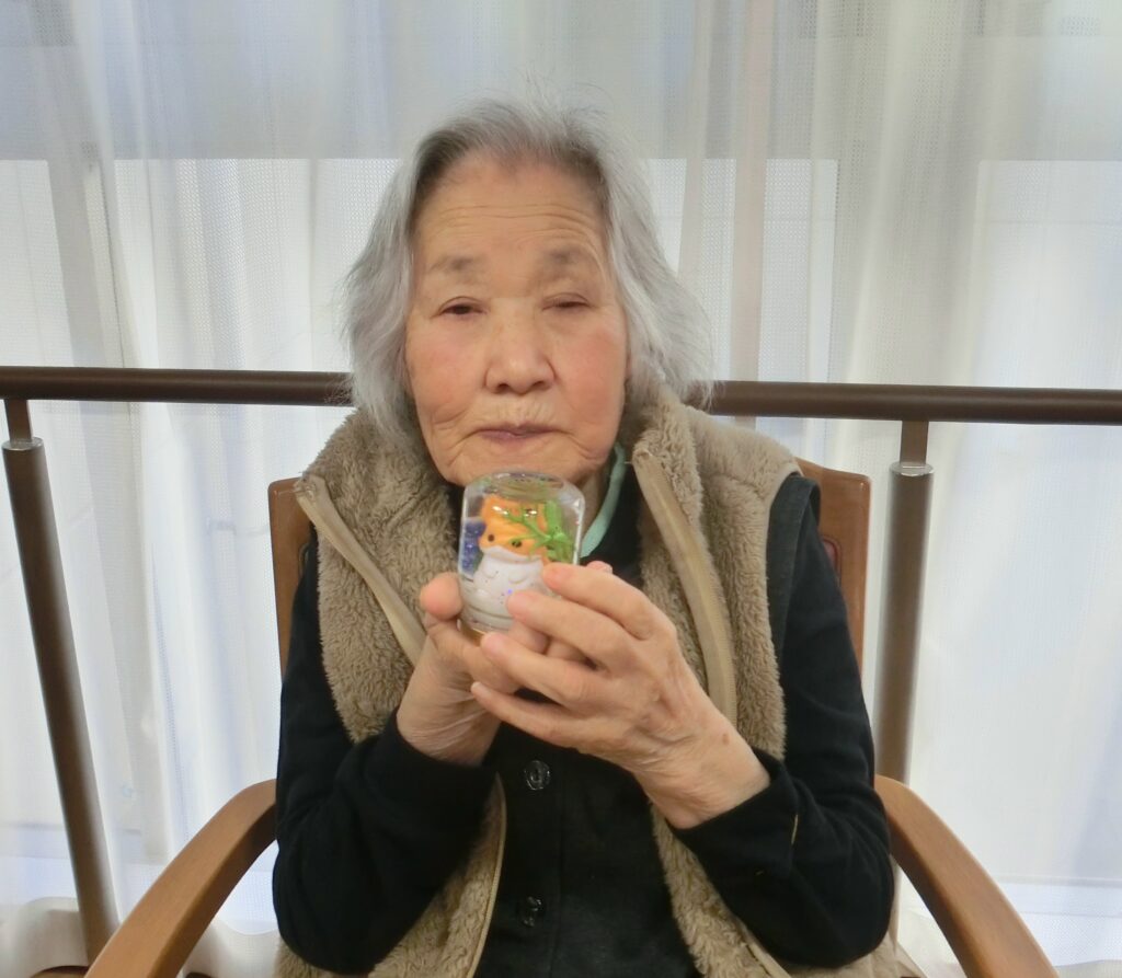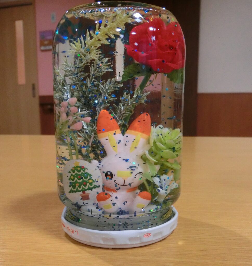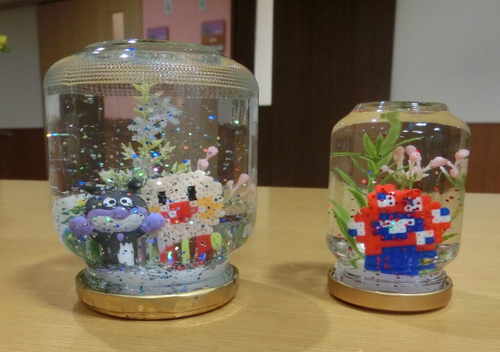 ミャクミャクとアンパンマンは先日、なのはなユニットの皆様と一緒にアイロンビーズで作りました。「瓶を振るとキラキラしてきれいじゃな」「かわいいのができた」と喜んでおられました。