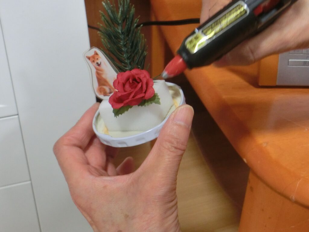 最初に中に入れる物を決めてグルーガンでスポンジにつけます。