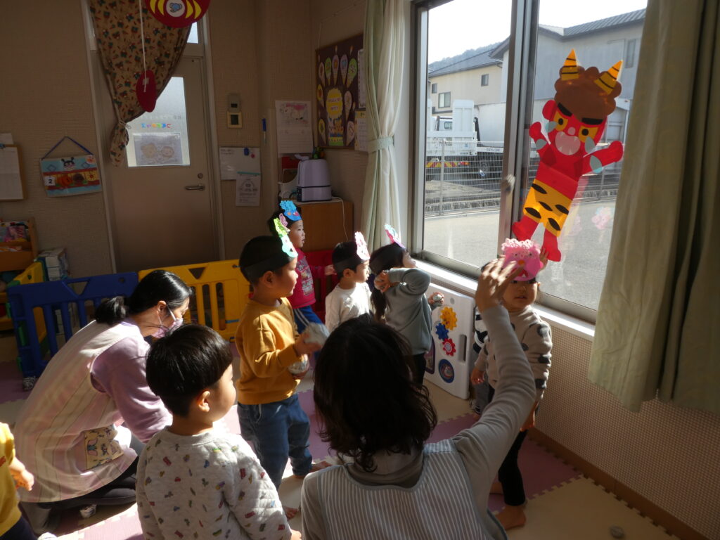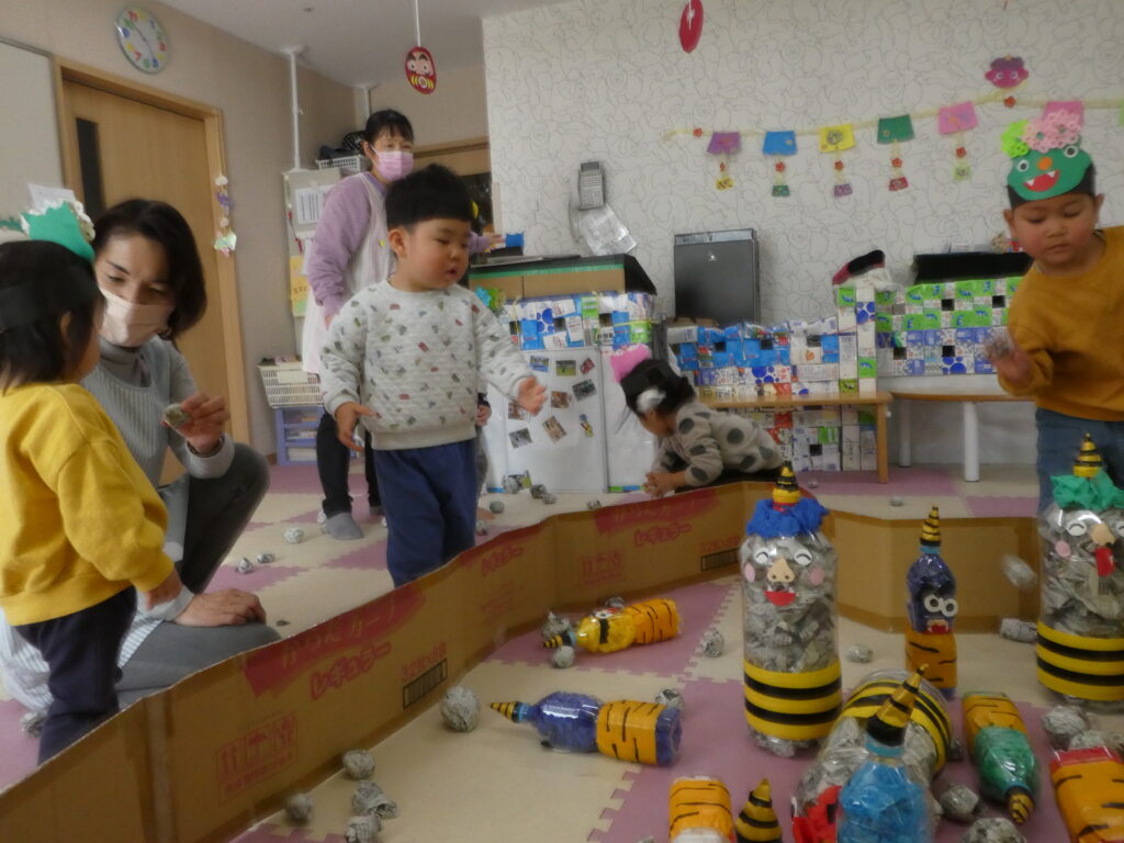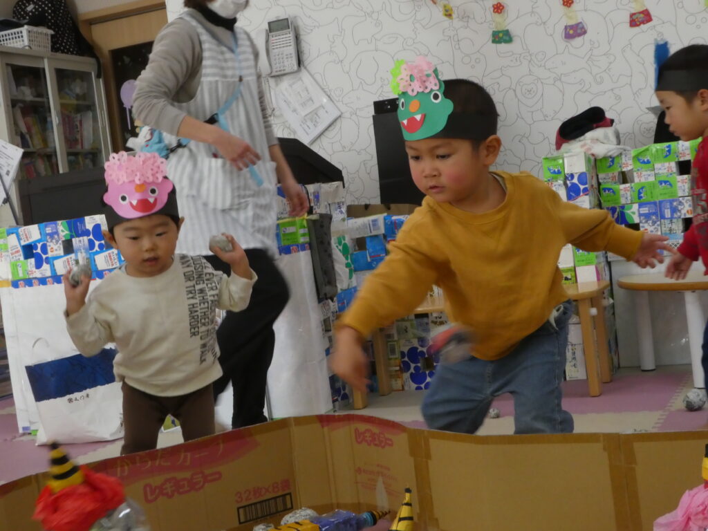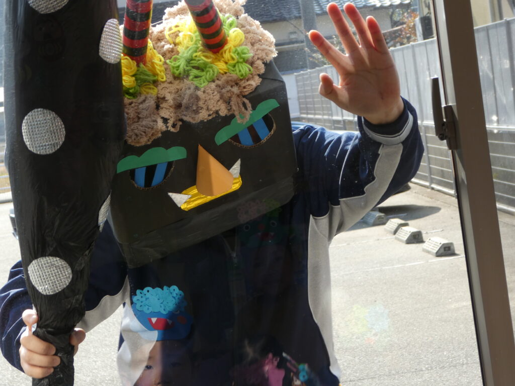 その後、みんなで鬼退治をしました。「鬼は~そと! 福は~うち!!」と言いながら、大きな声で鬼を退治する事ができました😊