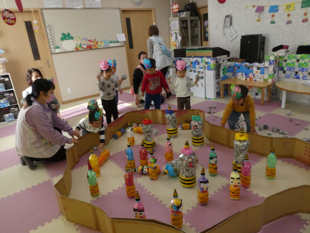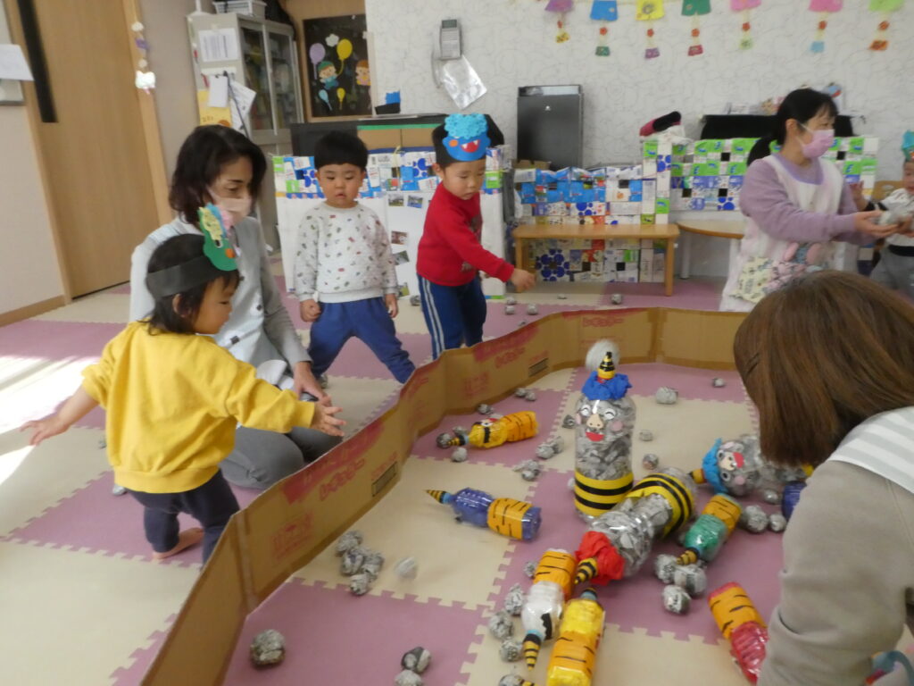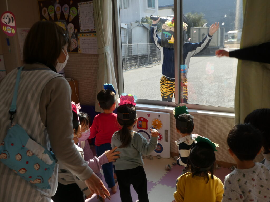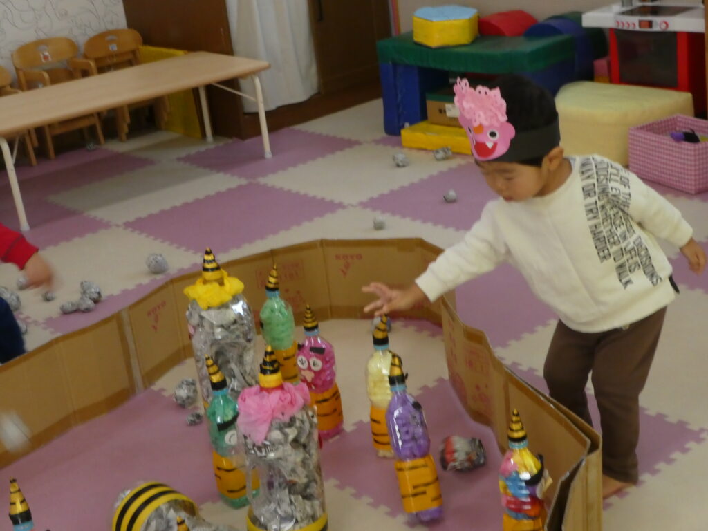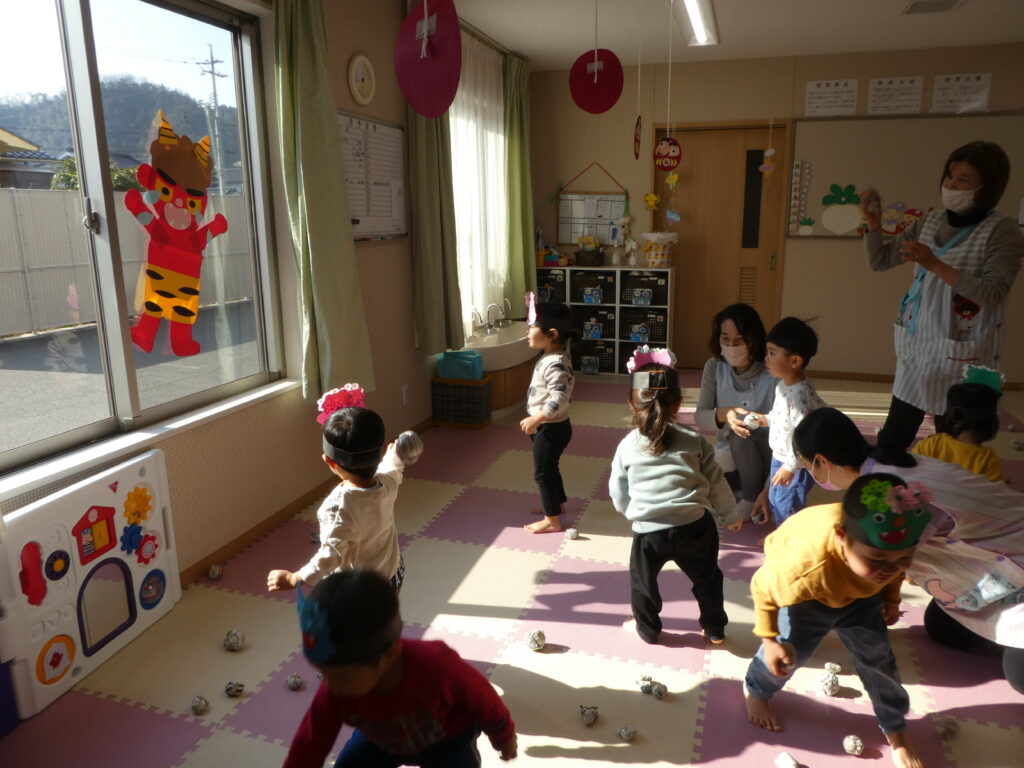 その後、みんなで鬼退治をしました。「鬼は~そと! 福は~うち!!」と言いながら、大きな声で鬼を退治する事ができました😊