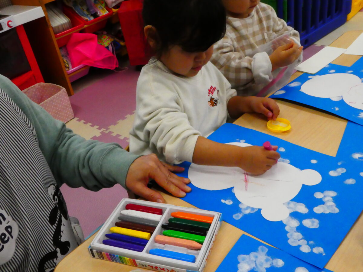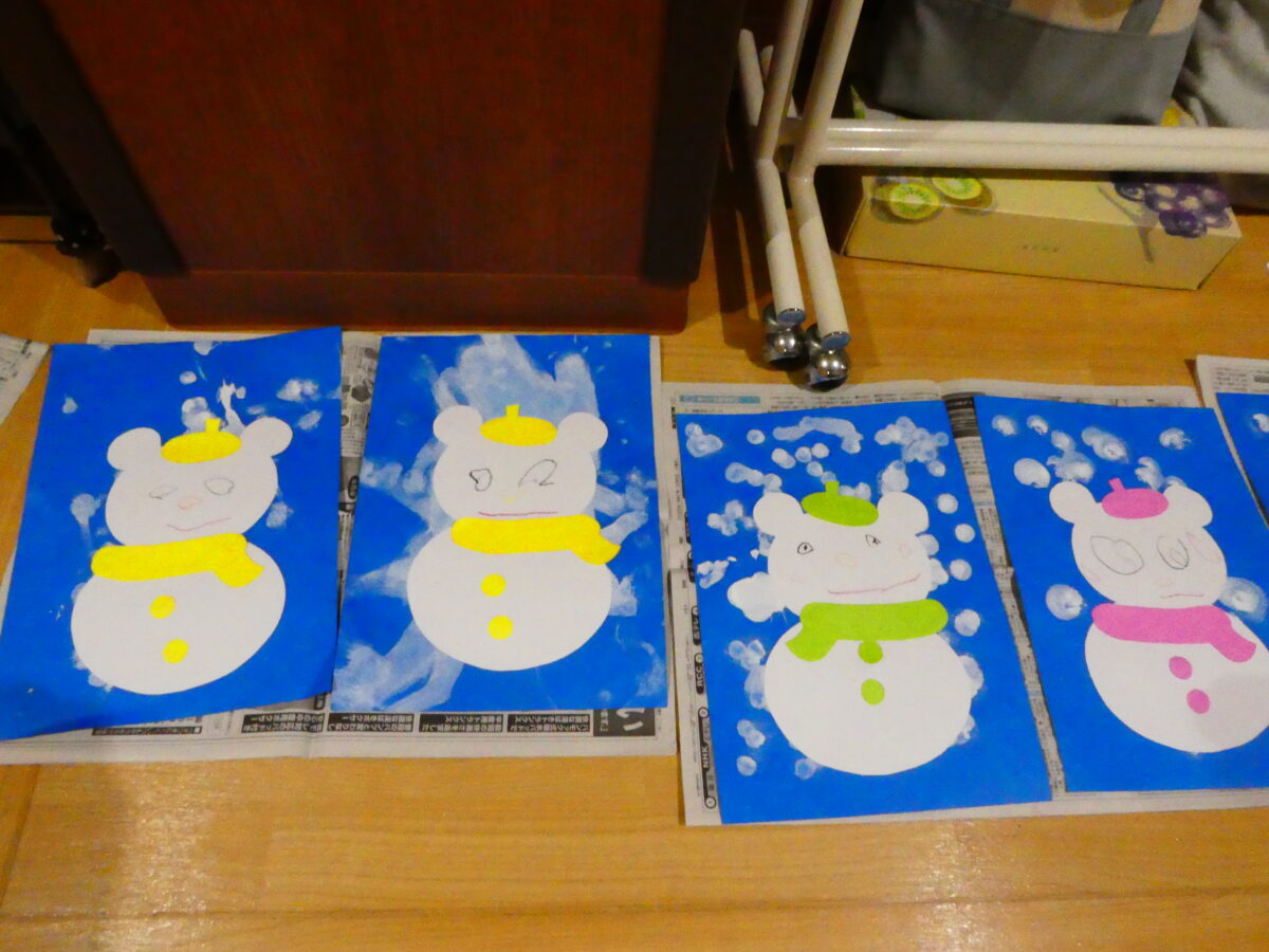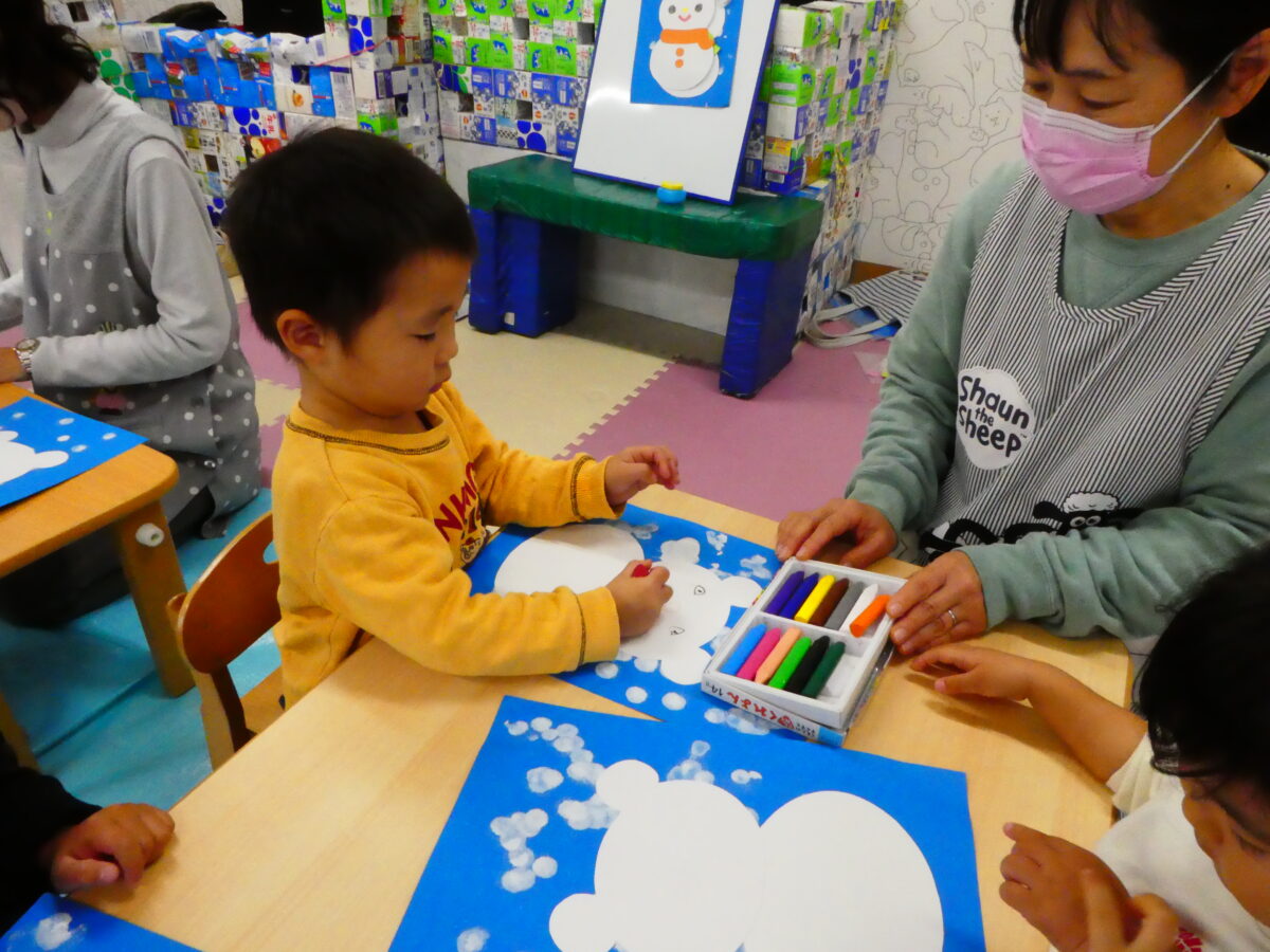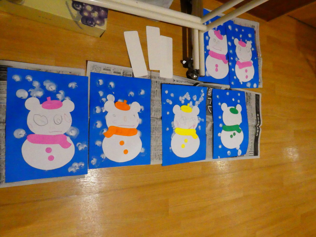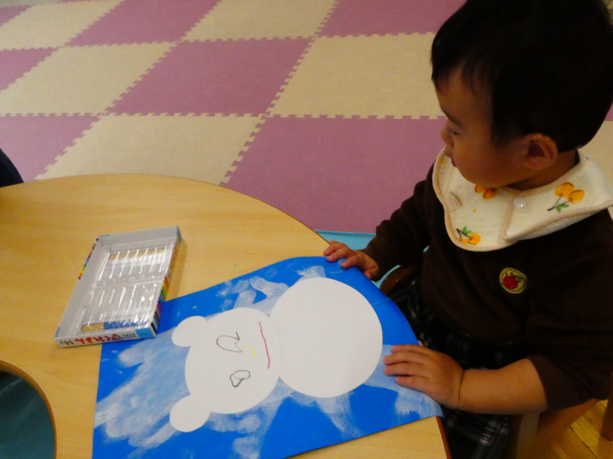 2回に分けて、壁面製作をしました。今日は、雪だるまにクレヨンで顔を描き、帽子やマフラーを糊付けしました😊