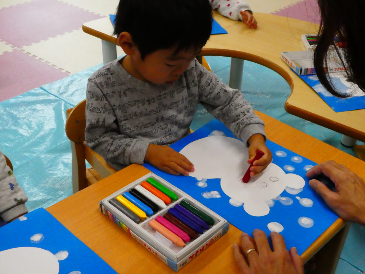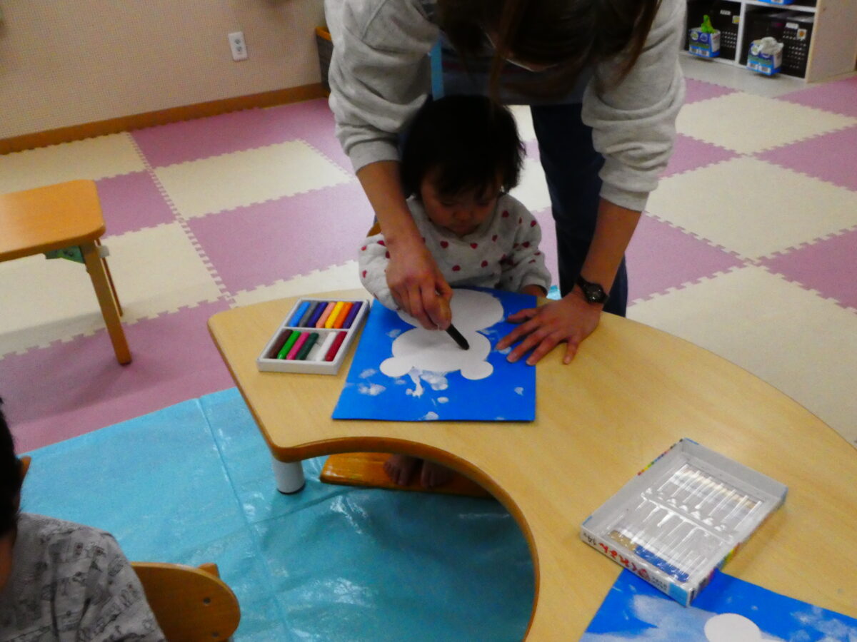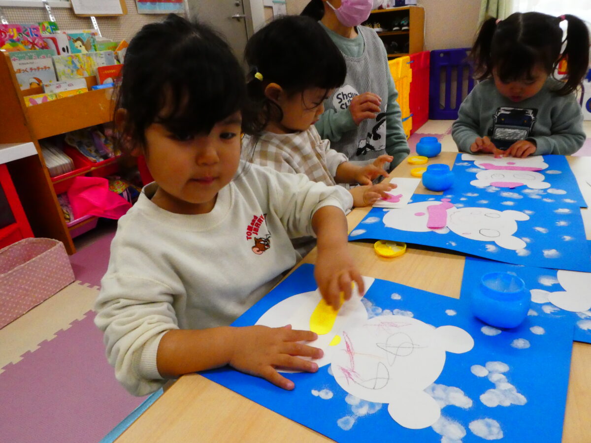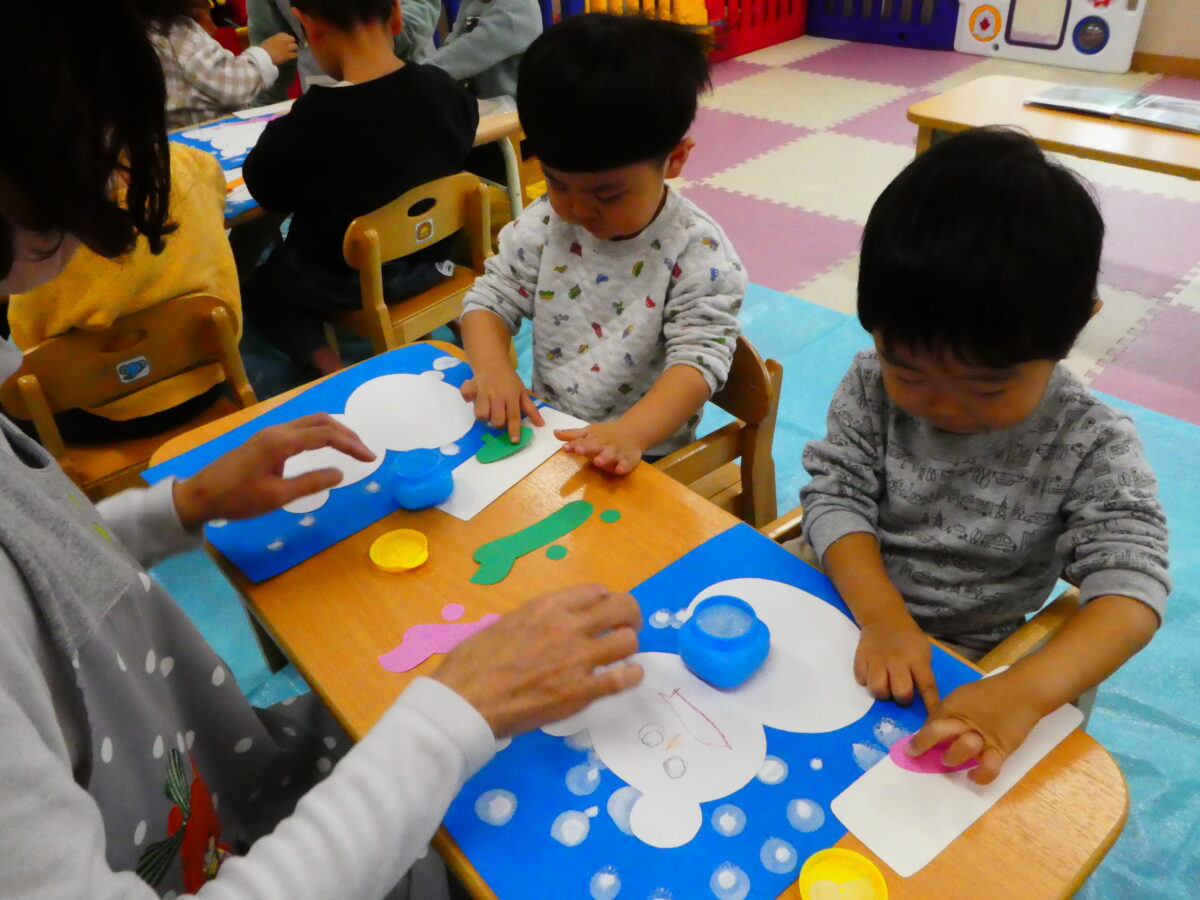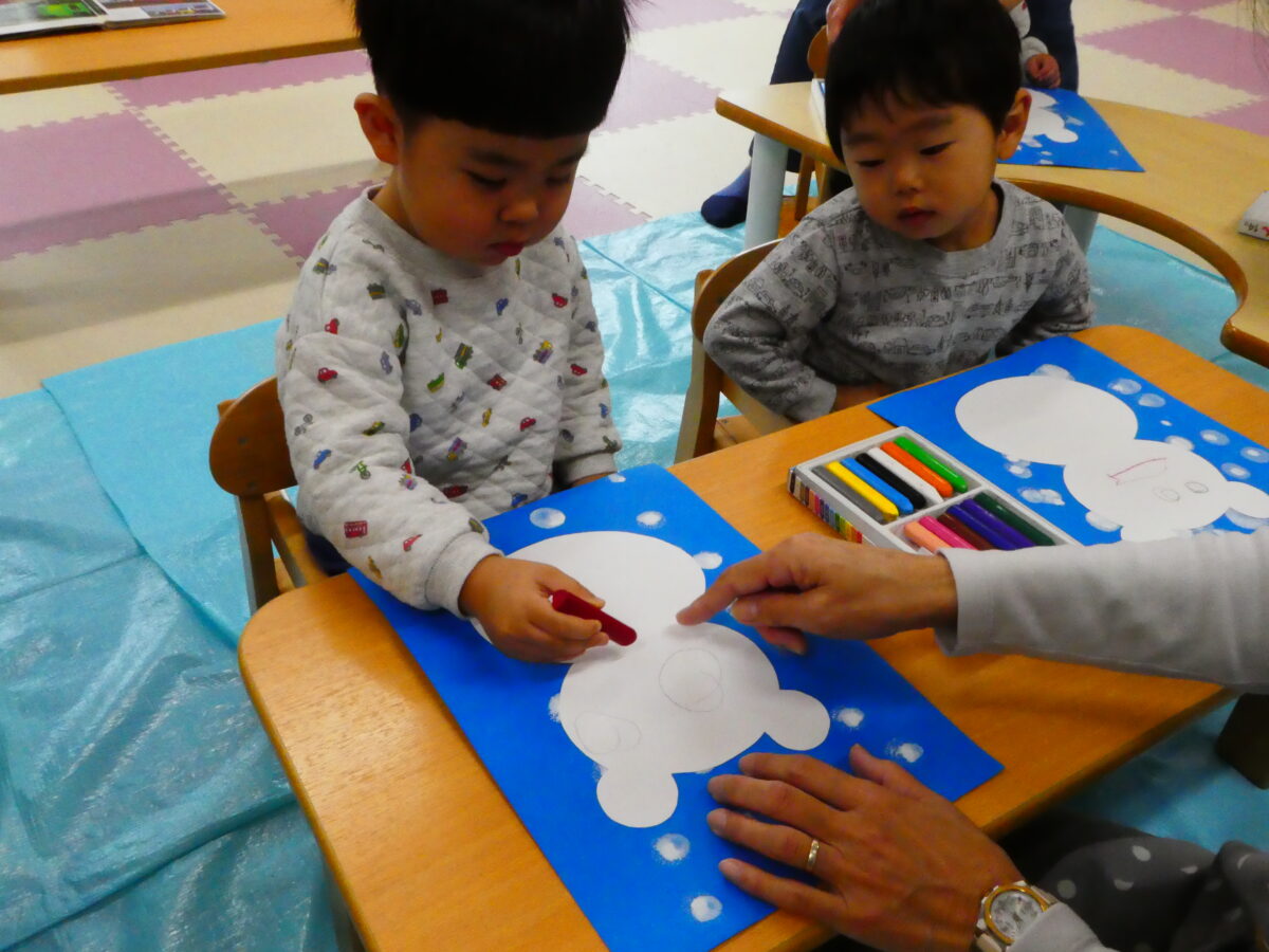 2回に分けて、壁面製作をしました。今日は、雪だるまにクレヨンで顔を描き、帽子やマフラーを糊付けしました😊